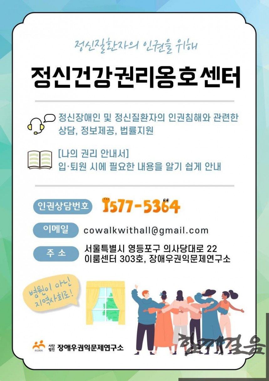 사단법인 장애우권익문제연구소(이사장 김성재)는 2022. 5. 1. ‘정신건강권리옹호센터’를 개소하여 활동에 돌입하였다.