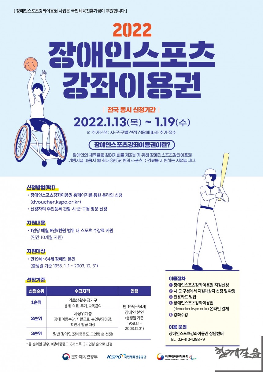 자세한 내용은 장애인스포츠이용권 상담센터(02-410-1298~9)로 문의하면 된다.