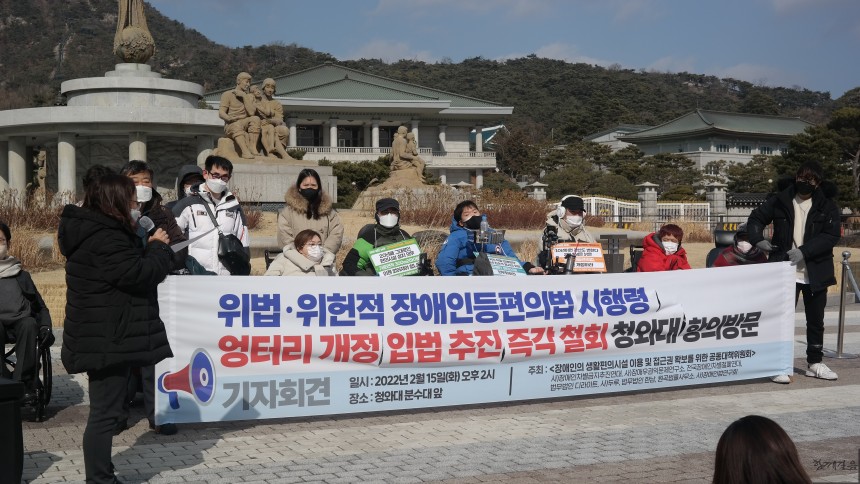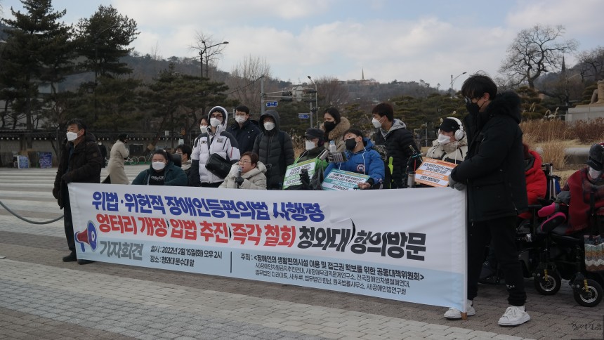장애인 생활편의시설 이용 및 접근권 확보를 위한 공동대책위원회(이하 공동대책위원회)는 오늘(15일) 오후 2시 청와대 앞에서 보건복지부의 장애인등편의법 시행령 일부 개정 입법 추진 계획에 대한 반대 기자회견을 열었다.