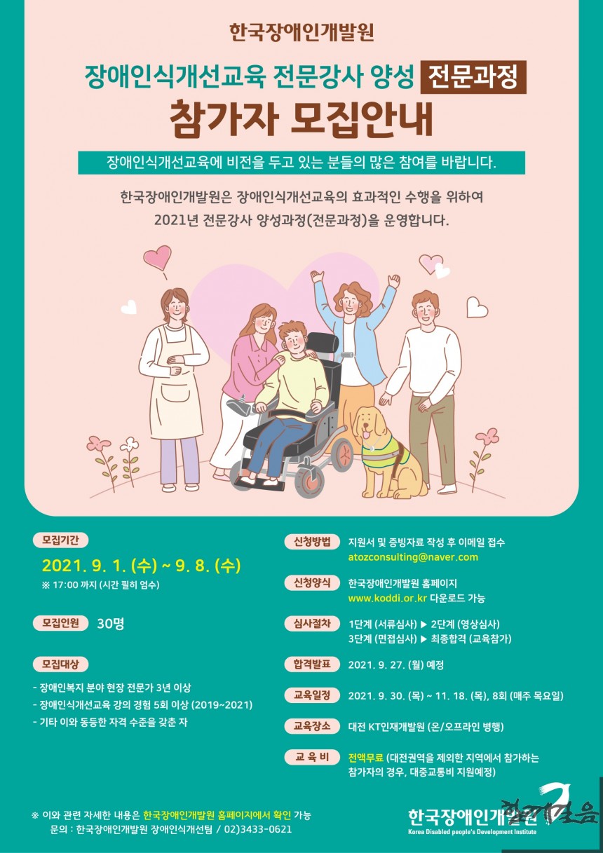 한국장애인개발원(원장 최경숙)은 양질의 장애인식개선교육 제공을 위하여 우수한 장애인식개선교육 전문강사를 발굴하고자 「2021년 장애인식개선 전문강사 양성과정」 참가자를 모집한다.