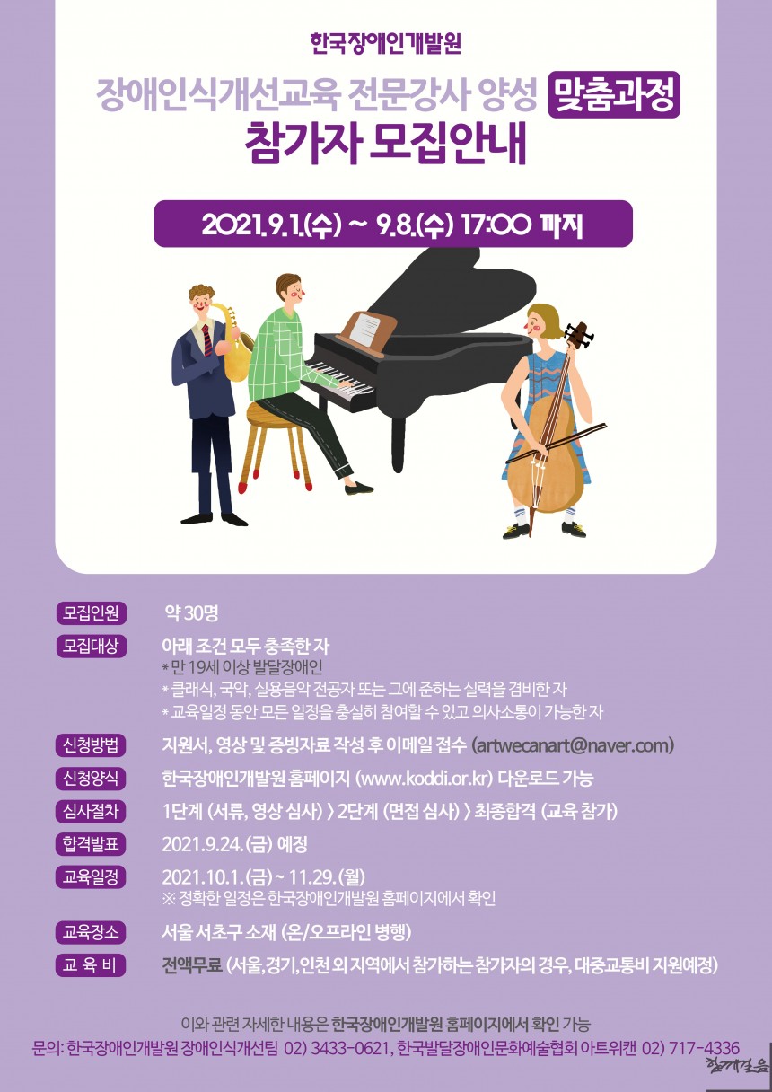 접수기간은 9월 1일(수)부터 9월 8일(수) 17시까지(시간 엄수) 이며, 각 과정별 제출 서류, 교육 운영 내용 등 자세한 내용은 한국장애인개발원 홈페이지 공지사항에서 확인할 수 있다.