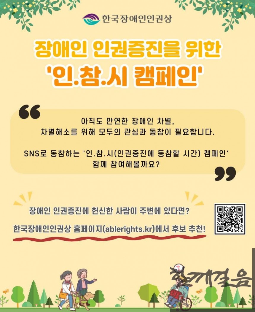 한국장애인단체총연맹에서는 현재 진행 중인 한국장애인인권상 후보 접수와 함께 장애인 인권 실천 메시지를 온라인에 공유하는 대국민 캠페인 ‘인권증진에 동참할 시간(아래 인.참.시)’를 진행하고 있다.