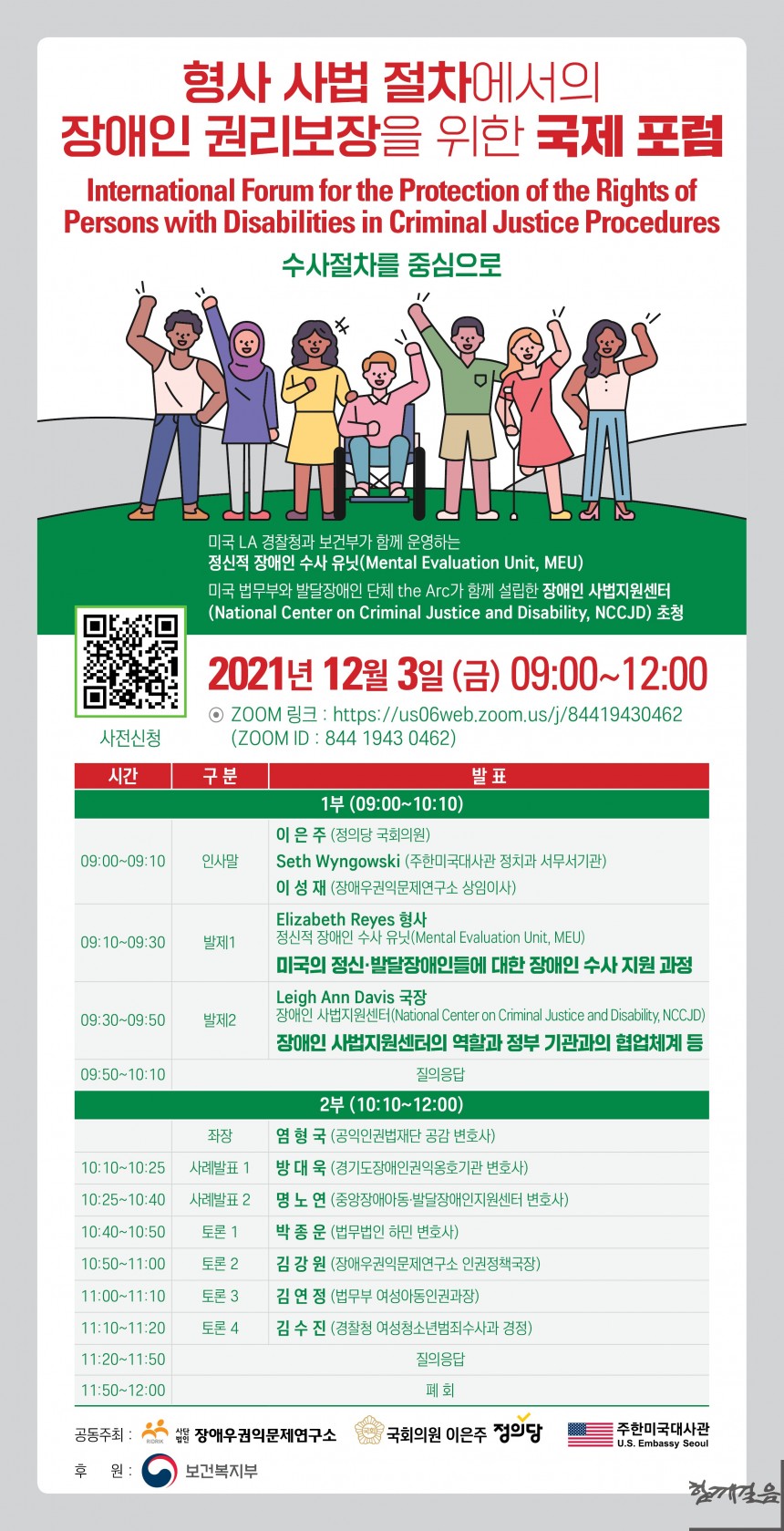 한편, 이번 형사 사법지원 절차에서의 장애인 권리보장을 위한 국제포럼은 (사)장애우권익문제연구소, 주한미국대사관, 정의당 이은주 의원의 공동주최로 진행되며 보건복지부의 지원으로 개최된다.