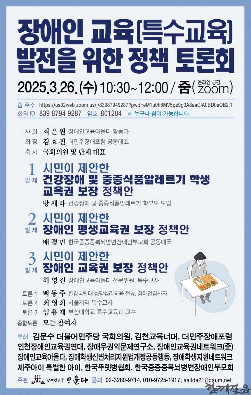 토론회와 관련해 문의사항이 있다면, 장애인교육아올다 사무국(02-3280-9714, 010-9725-1917, aallda21@daum.net)으로 연락하면 된다.