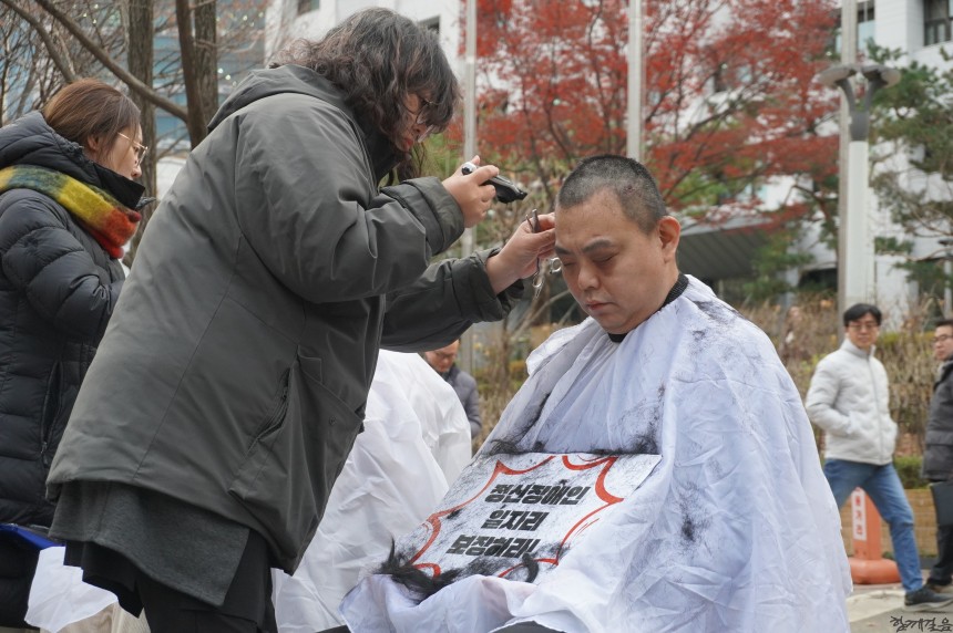 정신장애 연대 단체, 서울시 의회 앞에서 기자회견 열어, 삭발식 등 퍼포먼스 진행
