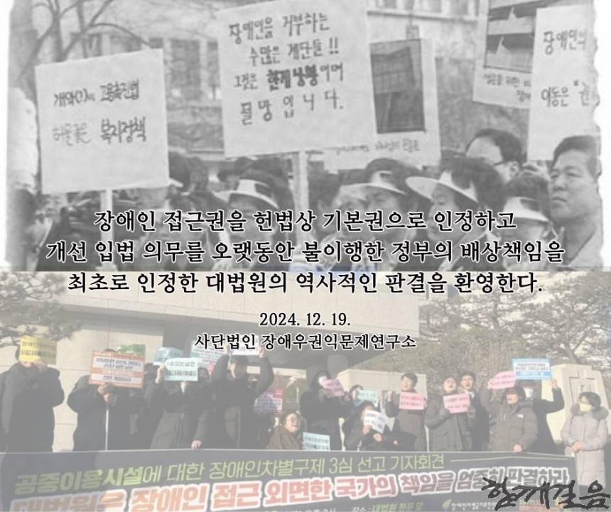 2024년 12월 19일, 대한민국 대법원이 장애인의 접근권을 헌법상 기본권으로 명확히 인정하고 국가의 행정입법 부작위에 대한 책임을 인정하며 장애인에게 위자료를 지급하도록 명령한 최초의 역사적인 판결을 우리는 뜨겁게 환영한다.