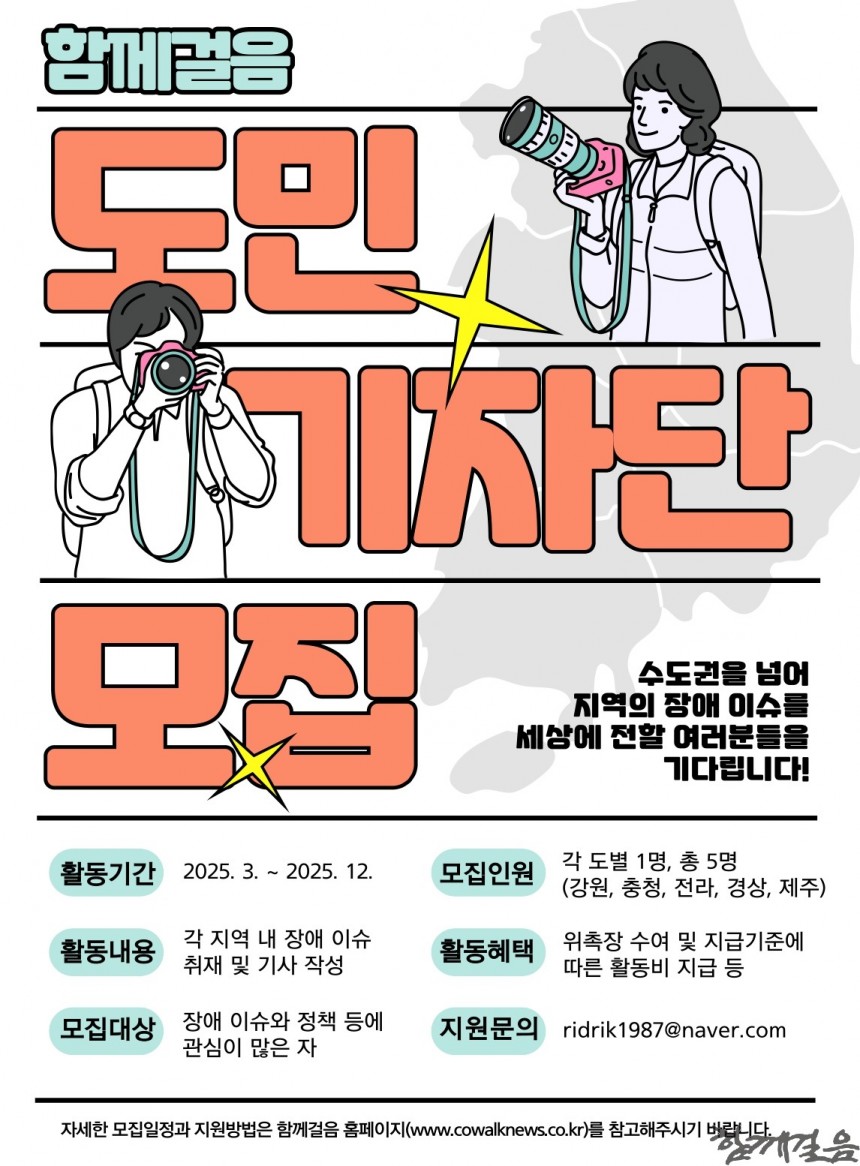 이번 도민 기자단 모집은 서울·경기를 제외한 강원, 충청, 경상, 전라, 제주 지역의 장애 관련 이슈와 정책을 발굴하고 취재할 수 있는 사람을 대상으로 한다. 현장 복지 및 행정기관 종사자, 장애인 당사자 및 가족은 우대 선발된다.