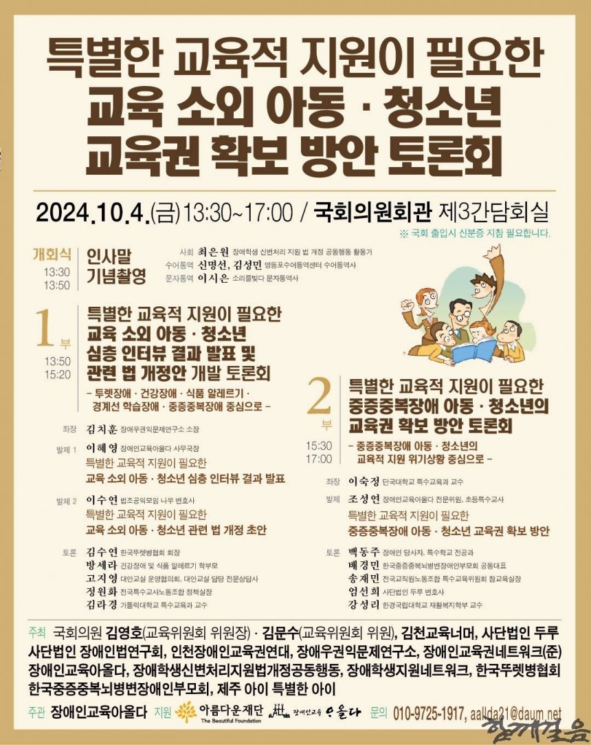오는 10월 4일(금) 오후 1시 30분, 국회의원회관 제3간담회실에서 국회의원 김영호(국회 교육위원회 위원장)와 김문수(국회 교육위원회 위원)를 비롯한 전국 11개 장애인교육복지 및 인권단체가 국회의원회관 제3간담회실에서 특별한 교육적 지원이 필요한 교육 소외 아동·청소년의 교육권 확보 방안을 논의하는 토론회를 공동 개최한다. 이번 토론회는 최은원 활동가(장애학생 신변처리 지원 법개정 공동행동)의 사회로 진행될 예정이다.