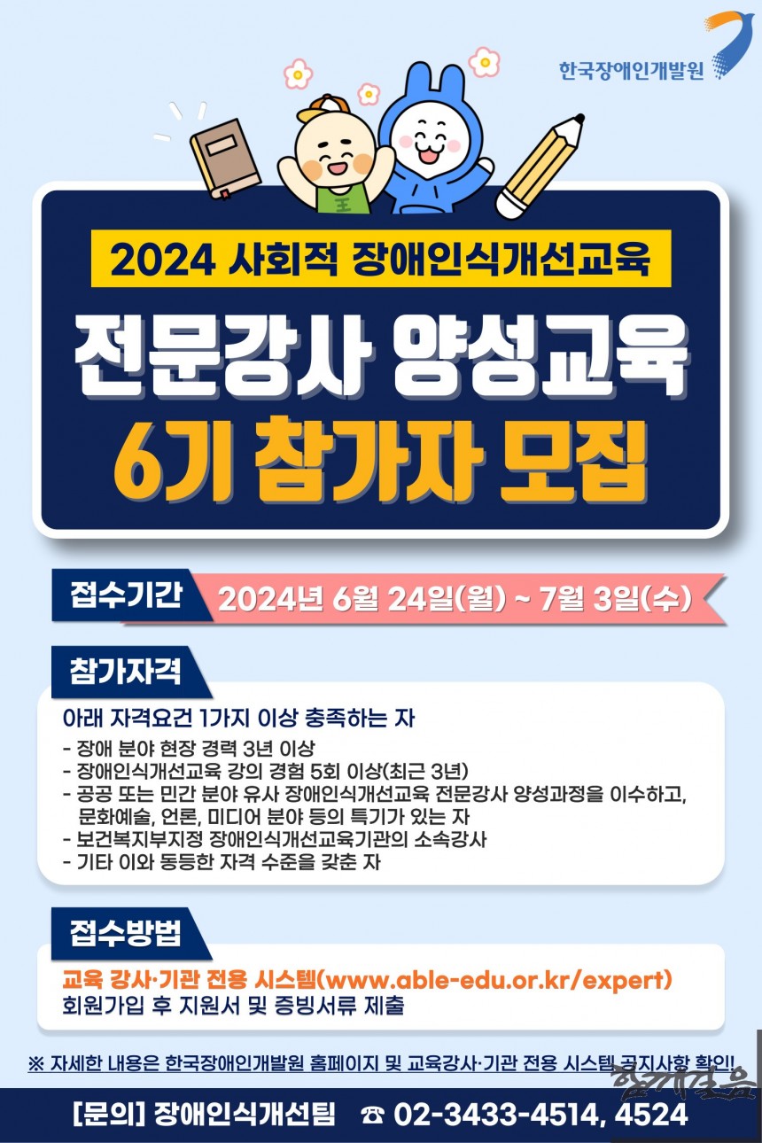 한국장애인개발원이 오는 6월 24일부터 7월 3일까지 '2024년 장애인식개선교육 전문강사 양성교육(전문과정)' 6기 참가자를 모집한다.