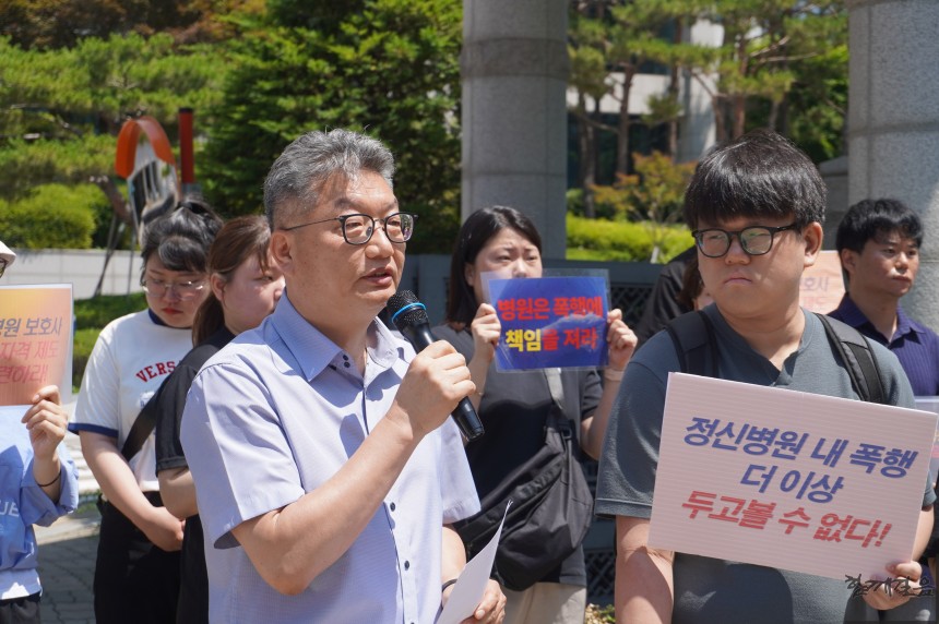 이어 한국정신장애인연합회 위은솔 정책부위원장은 “병원에 CCTV가 있었다는 이유로 병원이 양벌규정의 책임을 피해갔지만 사실 우리는 그 CCTV가 환자를 보호하기 위해 설치한 것이 아니라 감시하기 위한 것임을 알고 있다”며 “이 사태를 보호사 개인의 책임으로 물어버린다면 이런 폭행 사태는 계속해서 반복될 것이므로 철저한 재조사를 통해 피해자의 잘못이 아님을 입증해야한다”고 말했다.