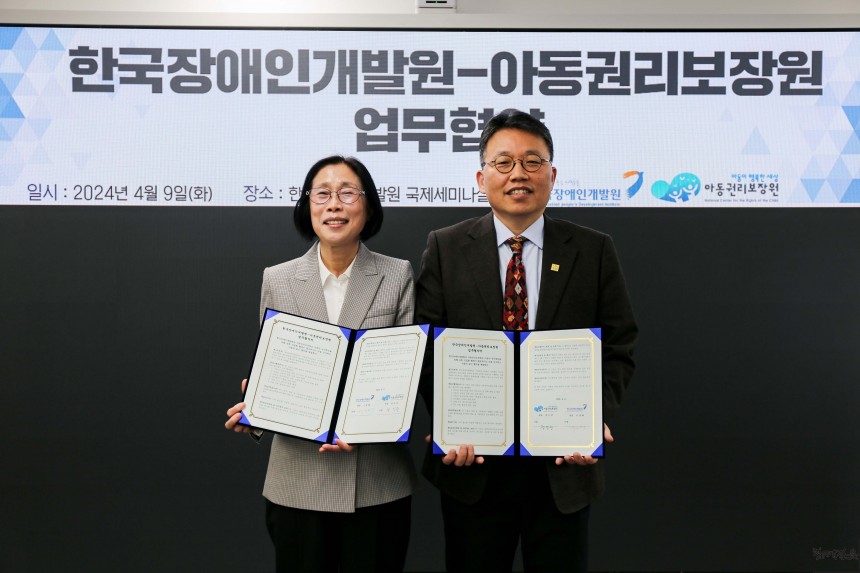 한국장애인개발원(원장 이경혜, 이하 개발원))과 아동권리보장원(원장 정익중)은 4월 9일(화) 오전 개발원 국제세미나실에서 장애포괄적 아동권리 증진을 위한 업무협약을 체결했다.