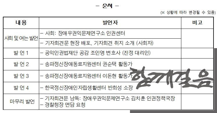기자회견은 장애우권익문제연구소 인권센터의 사회로 진행되며 진정 대리인인 공익인권법재단 공감 조인영 변호사, 송파정신장애동료지원센터 권순택 활동가, 송파정신장애동료지원센터 이돈현 활동가, 한국정신장애인자립생활센터 반희성 소장의 발언과 장애우권익문제연구소 김치훈 인권정책국장의 기자회견문 낭독으로 진행될 예정이다.