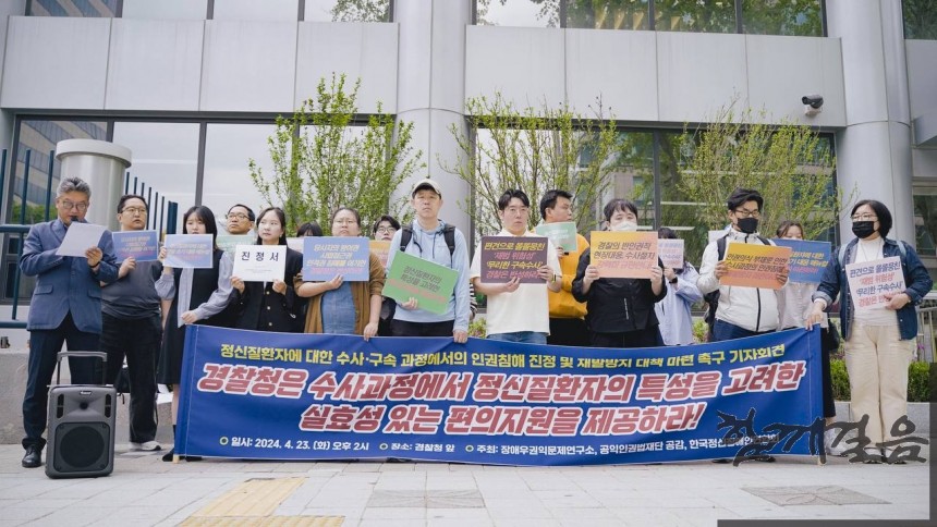 장애우권익문제연구소(이하 연구소), 공익인권법재단 공감, 한국정신장애인연합회는 오늘(23일) 오후 2시 경찰청 앞에서 사회적 편견에 휩싸여 정신질환자의 인권을 침해하는 경찰의 불공정한 수사 관행을 규탄하며, 정신질환자에게도 사법 정의가 평등하게 구현될 수 있도록 구체적인 대책 마련을 촉구하는 기자회견을 진행했다.