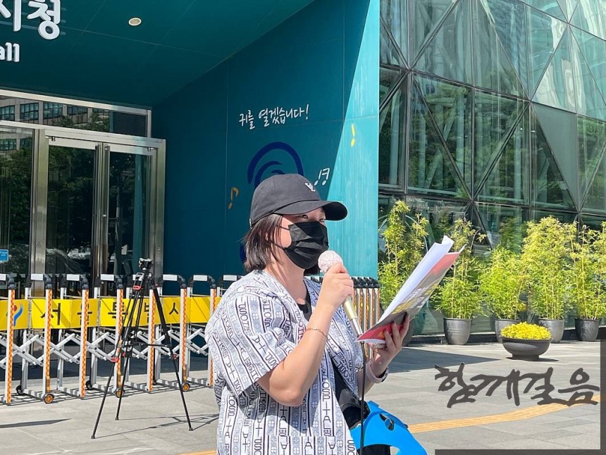 이어 송파정신장애동료지원센터 이승주 팀장은 임금의 현실화를 촉구하며 “우리는 서울시에 당장은 아니더라도 ‘동일 노동 동일 임금’의 법칙에 따라 같은 임금을 받게 해 달라고 꾸준히 요청해왔으나 시는 꿈쩍도 하지 않았다”고 밝혔다. 또 “서울시는 내년 사업평가 후에 지원 여부를 검토하겠다고 고장난 녹음기처럼 같은 말만 반복하고 있다”며 지속적인 요구에도 변하지 않는 서울시의 태도에 분노한다고 밝혔다.