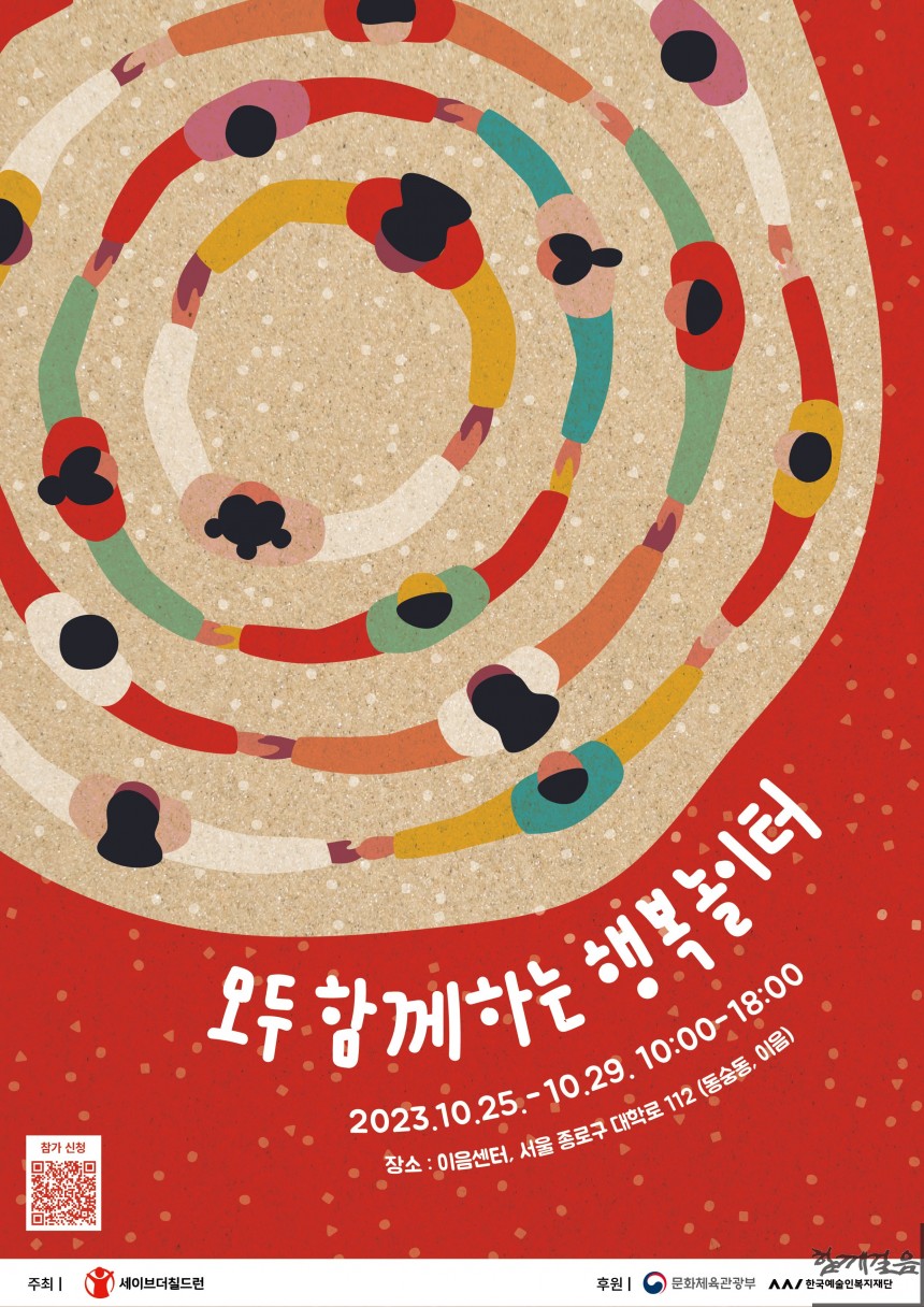 세이브더칠드런 주관(후원: 문화체육관광부, 한국예술인복지재단)은 10/25(수)-10/29(일) 10시부터 18시까지 서울 대학로 이음센터에서 모두 함께하는 행복놀이터' 배리어프리 전시회를 개최한다.
