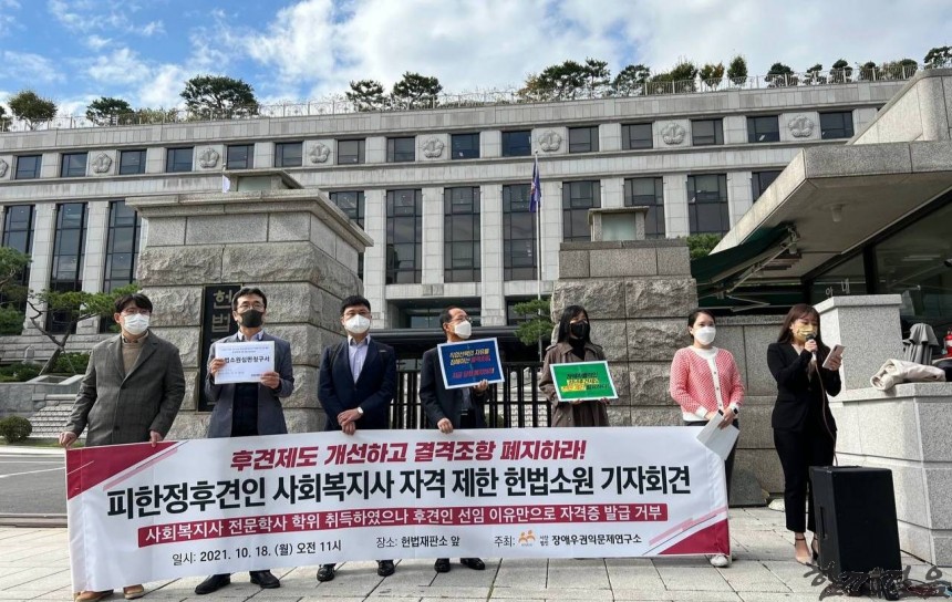 △ 2021년 10월 18일 후견인 선임 이유만으로 자격증 발급이 거부된 지적장애인에 대한 헌법소원을 청구하며 기자회견을 진행함