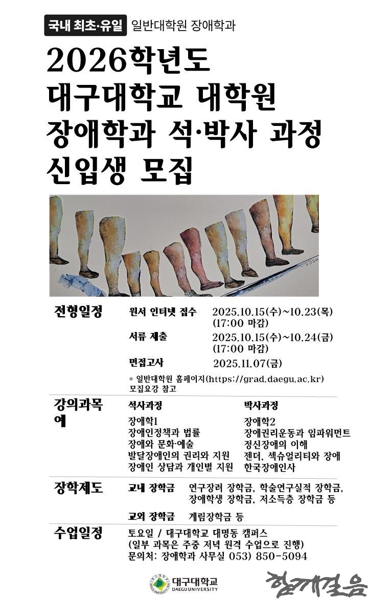 대구대학교 일반대학원 장애학과가 오는 2025년 10월 15일부터 23일 오후 5시까지 2026학년도 석·박사 과정 신입생을 모집한다.