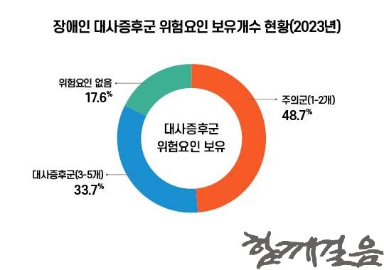 장애인의 건강 관련 지표를 보면, 2023년 기준으로 대사증후군 위험요인을 한 가지 이상 가진 비율이 82.4%에 달했으며, 3~5개 요인을 동시에 가진 비율(대사증후군 진단 수준)도 33.7%로 나타났다. 주요 위험요인은 높은 혈당(54.4%), 높은 혈압(49.9%), 복부비만(35.7%) 순이었다. 여성 장애인의 대사증후군 비율은 남성보다 6.8%p 높아 성별 간 건강 격차도 존재했다.