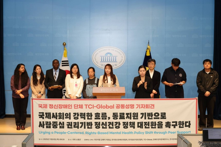 6일 오전 국회 소통관에서 열린 기자회견에서 국제 심리사회적장애인 인권단체 TCI-Global(Transforming Communities for Inclusion)과 한국정신장애인연합회, 한국동료지원인협회, 한국장애포럼(KDF), 장애우권익문제연구소, 법무법인 디엘지, 그리고 국민의힘 김예지 국회의원실은 공동성명을 발표하고 정부와 국회에 정책 대전환을 촉구했다.