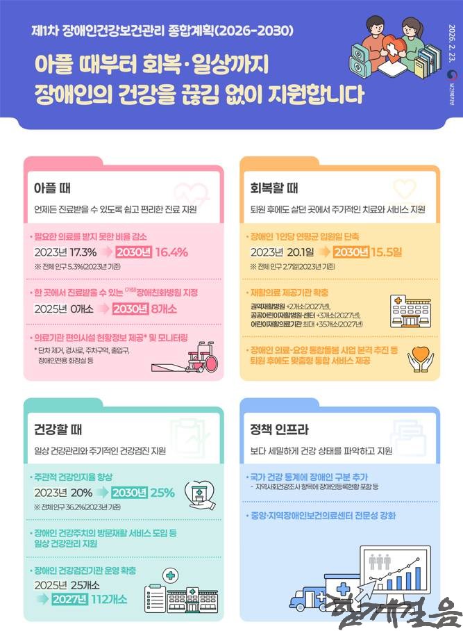 정부는 제27차 장애인정책조정위원회(위원장 : 국무총리) 심의·의결을 거쳐 “장애인 누구나 건강하고 행복한 삶 실현”을 목표로 하는 「제1차 장애인 건강보건관리 종합계획(2026~2030)」을 확정·발표하였다.