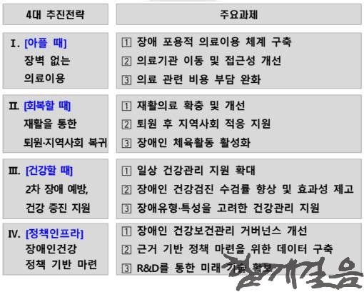 이에 정부는 장애인단체, 의료전문가 등 이해관계자의 의견수렴을 거쳐, ▲장벽 없는 의료이용, ▲재활을 통한 퇴원·지역사회 복귀, ▲2차 장애 예방, 건강 증진 지원, ▲장애인건강 정책 기반 마련을 중점전략으로 하여 12대 주요과제 및 32개 세부 추진과제를 제시하였다.