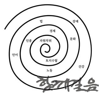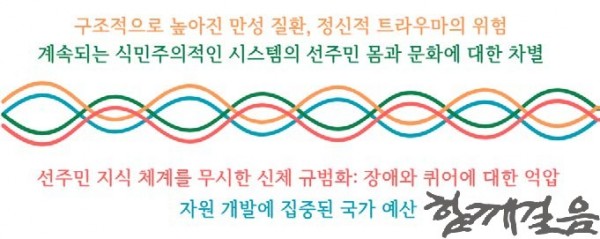나는 식민주의를 하나의 나선형으로 이해한다. 그 중심에는 자원착취가 있고, 그로부터 인종차별적인 법과 정책, 언어의 억압, 문화 말살, 교육 통제, 노동 착취, 건강 불평등이 뻗어 나간다. 그리고 그 나선형 위에는 장애도 놓여 있다.